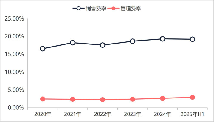 所以,从永辉超市的费用端来看,销售费用是永辉超市费用端最大的支出,且销售费率呈现逐年上升的趋势,截止2025年中报永辉超市的销售费率将近20%。营业收入不断下滑,销售费支出不减反增,直接拖累了企业净利润的改善。
