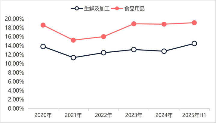但是从永辉超市核心产品情况来看,核心产品的核心竞争力目前还是非常不错。永辉超市的零售业务主要分为生鲜及加工和食品用品两大类。按照2020年至2025年中报生鲜及加工和食品用品两大业务板块的毛利率情况来看,这两大板块的毛利率呈现缓慢的上升趋势。毛利率呈现上升趋势,一方面说明企业销售的商品并没有因为竞争而下降,另一方面说明企业通过改革降低了运营环节的生产成本。
