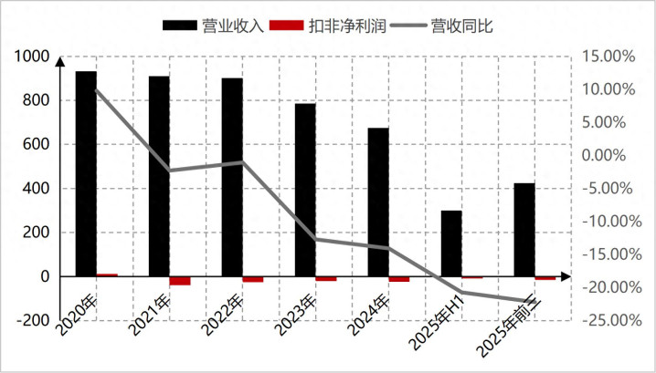 永辉超市业绩持续亏损将近五年时间,2025年三季度营业收入同比下滑26%,扣非净利润亏损15亿元,亏损幅度还在加大。