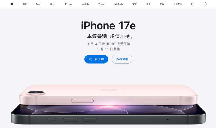 每经AI快讯,3月2日,苹果中国官网上线新款iPhone17e手机,4499元人民币起售,存储256GB起步,3月4日晚10:15接受预购。