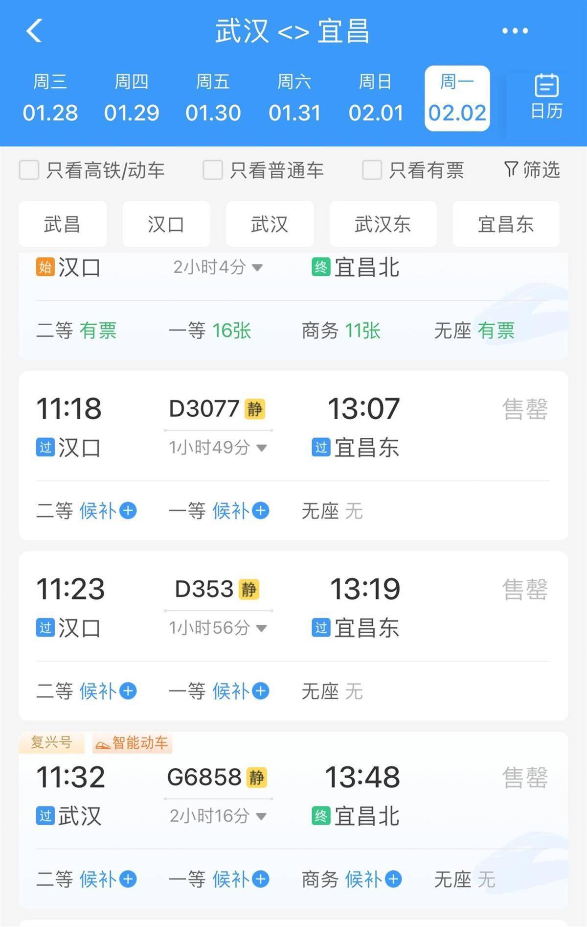 2月2日,广州、深圳方向前往武汉的车次中,已有多趟显示售罄,还有几个车次仅剩商务座或一等座。合肥前往武汉的车次中,绝大多数已售罄,70多个车次仅剩约20个车次还有余票。此外,北京、上海方向前往武汉的车次,余票基本上都十分充足。